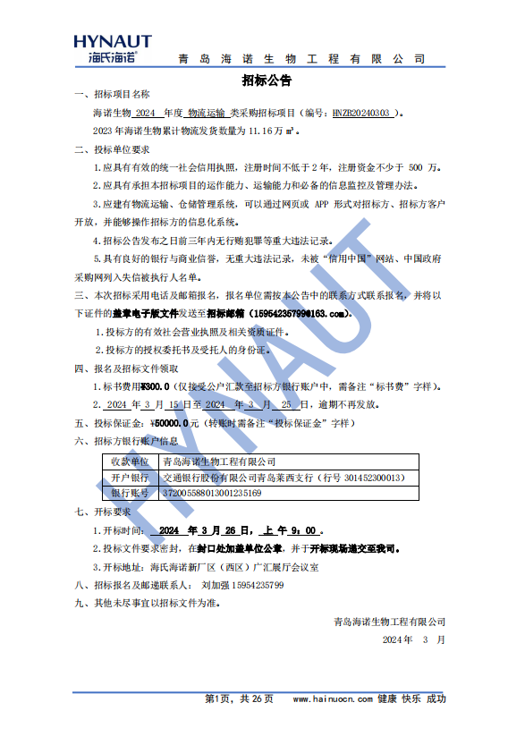 2024年度海諾生物物流運輸類采購招標公告