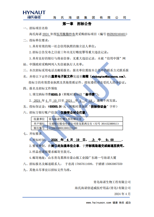 海氏海諾醫(yī)用脫脂紗布類采購項目招標(biāo)公告